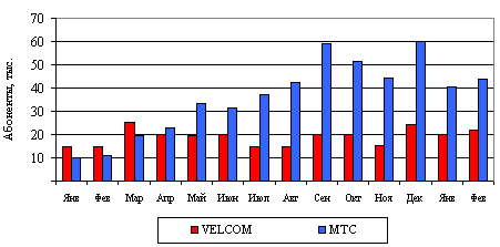 По размеру абонентской базы лидером на рынке продолжает оставаться VELCOM, число абонентов которого оценивается в 672 тыс. при приросте за месяц +3,38% или 22 тыс., что несколько превышает показатели последних месяцев, за исключением декабря. Наиболее значимым событием компании в феврале, очевидно, повлиявшим на показатели роста абонентской базы, стало снижение входного порога при подключении к сети. Долгое время VELCOM оставался на белорусском рынке компанией с максимальным "входным порогом" (минимальным первоначальным авансовым платежом при подключении к сети). С 12 февраля ситуация изменилась, - произошло снижение предоплаты до 40 тыс. руб. ($18,6), ранее "входной порог" составлял 60 тыс.($27,9). В связи с этим компания стала на белорусском рынке лидером по данному параметру для контрактных планов. Предоплата при подключении к сети cdma2000 1x DIALLOG составляет те же 40 тыс., однако необходимо приобретение аппарата у самой компании, что выливается в рост "входного порога". Неоднозначна ситуация с МТС. У компании сейчас максимальный "входной порог" на рынке для контрактных абонентов, хотя отрыв от конкурента и не большой. Минимальный авансовый платеж МТС при подключении по контракту составляет 42 тыс. руб. ($19,5). Однако в числе предложений оператора есть и prepaid ТП "Джинс-Классик" с минимальным на рынке "входным порогом" $7,4, хотя в эту сумму входит и реанимированный атавизм в виде оплаты подключения $1,86.