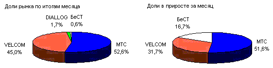 По итогам месяца абонентская база БеСТ составила 34 тыс. абонентов, прирост за месяц +21 тыс., - оператор, наконец, стал показывать результаты, характерные для стандарта GSM, по крайней мере, в приросте. Хотя у другого оператора "второго эшелона" DIALLOG сейчас около 100 тыс. абонентов, максимум подключений в течение месяца у него составлял в свое время лишь 10 тыс. Напомним, что прежний максимум БеСТ - всего 3,5 тыс. абонентов в марте.