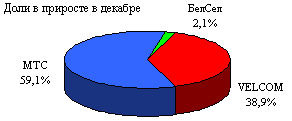 В итоге доли рынка по итогам декабря 2004 года и доли в приросте абонентских баз операторов в течение месяца распределены так: