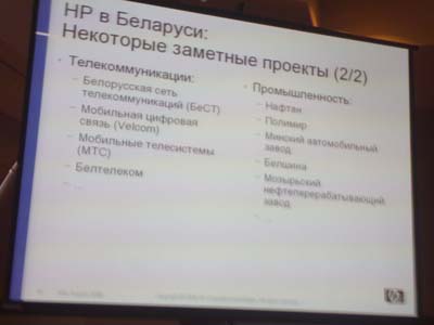 Ну а предпосылка таких планов - за последний год ИТ-рынок Беларуси демонстрировал стабильный рост и далее эти темпы должны сохраниться. Два дистрибутора и 40 партнеров HP хорошо поработали и согласно промежуточным результатам работы партнерской сети НР в Республике Беларусь в 2008 году практически по всем направлениям деятельности компании наблюдается рост на 47%. При этом спрос сместился "от дешевых аппаратных средств в сторону серьезных решений и программных услуг" требующих "экспертной поддержки в стране", чем и займется дочернее предприятие. - Лишь одно перечисление заказчиков последних крупных проектов группы TSG заняло у Константина два слайда.