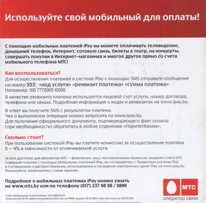 Услуга «Автооплата» – совместный проект СООО «Мобильные ТелеСистемы» и ОАО «АСБ Беларусбанк», позволяющий автоматизировать процесс оплаты услуг мобильной связи МТС с банковских карт-счетов клиентов, открытых в «АСБ Беларусбанк». Сервис избавит абонента от необходимости контролировать свой баланс и посещать пункты приема платежей, так как все необходимые для пополнения баланса действия выполнят с его санкции МТС и «Беларусбанк».