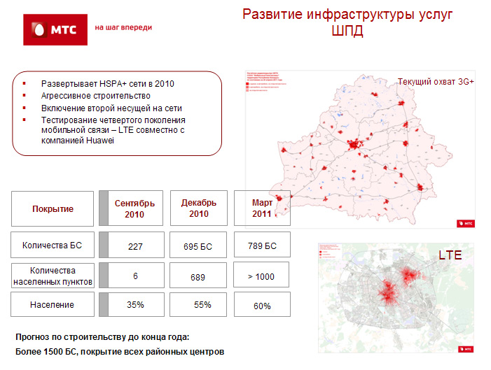 По словам генерального директора СООО "Мобильные ТелеСистемы" (МТС в Беларуси) Владимира Карповича, компания установила 789 базовых станций с поддержкой 3G, что позволило ей охватить более 1000 населенных пунктов и 60% населения страны. К концу года компания собирается установить более 1,5 тыс. базовых станций с 3G по всей стране и обеспечить покрытие всех районных центров. С момента запуска 3G (сентябрь 2010 года) МТС фиксирует 291% рост интернет-трафика у своих абонентов и говорит о 79% приросте уникальных пользователей услуг передачи данных, а прирост выручки от услуг передачи данных достиг 112%. Сейчас у МТС более 350 тыс. пользователей 3G.